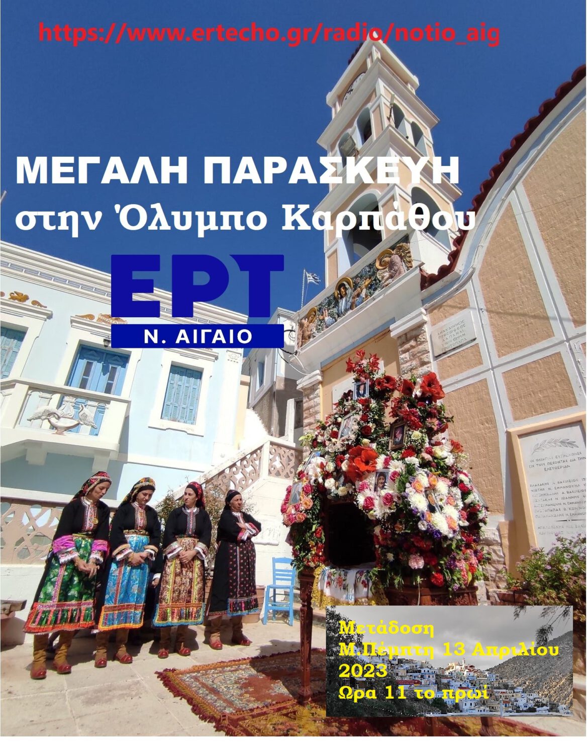 Η ΕΡΤ Ν. Αιγαίου ανασύρει από το αρχείο της εκπομπής ΑΝΤΙΛΑΛΟΙ ΑΠ΄ΤΑ ΔΩΔΕΚΑΝΗΣΑ ένα αφιέρωμα στην ΜΕΓΑΛΗ ΠΑΡΑΣΚΕΥΗ ΤΗΣ ΟΛΥΜΠΟΥ ΚΑΡΠΑΘΟΥ που μεταδόθηκε για πρώτη φορά τον Απρίλιο 1997.